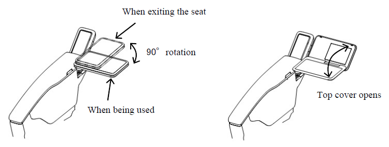 The armrests feature a retractable table with a two-piece design that can be unfolded, which replaces the conventional one-piece design. The table's cover can be adjusted to the desired angle, enabling a wide variety of uses.