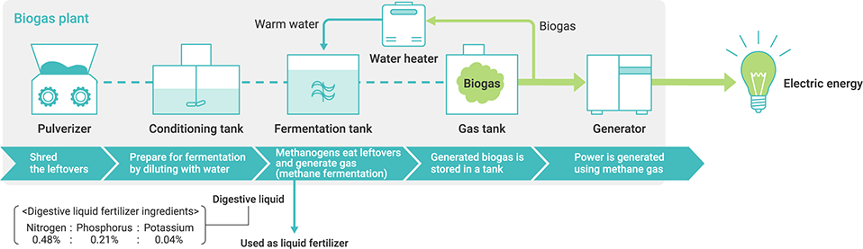CO2 emissions and food loss have been steadily reduced since the introduction of biogas power generation. The amount of biogas power generated is approximately 7,324 kWh per annum, equivalent to the power consumption of about three average households. In addition, CO2 emissions generated from the incineration and transportation of leftovers have been reduced.